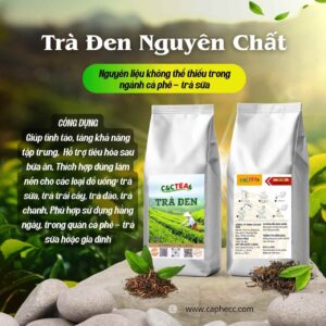 Trà Đen Nguyên Chất hay còn được gọi là Hồng Trà được tuyển chọn từ những búp trà chất lượng, chế biến theo phương pháp truyền thống, mang đến hương vị đậm nhưng không gắt, hậu ngọt kéo dài và thơm ấm rất đặc trưng. Đây là nguyên liệu quan trọng, gần như không thể thiếu trong ngành pha chế cà phê – trà sữa hiện nay.