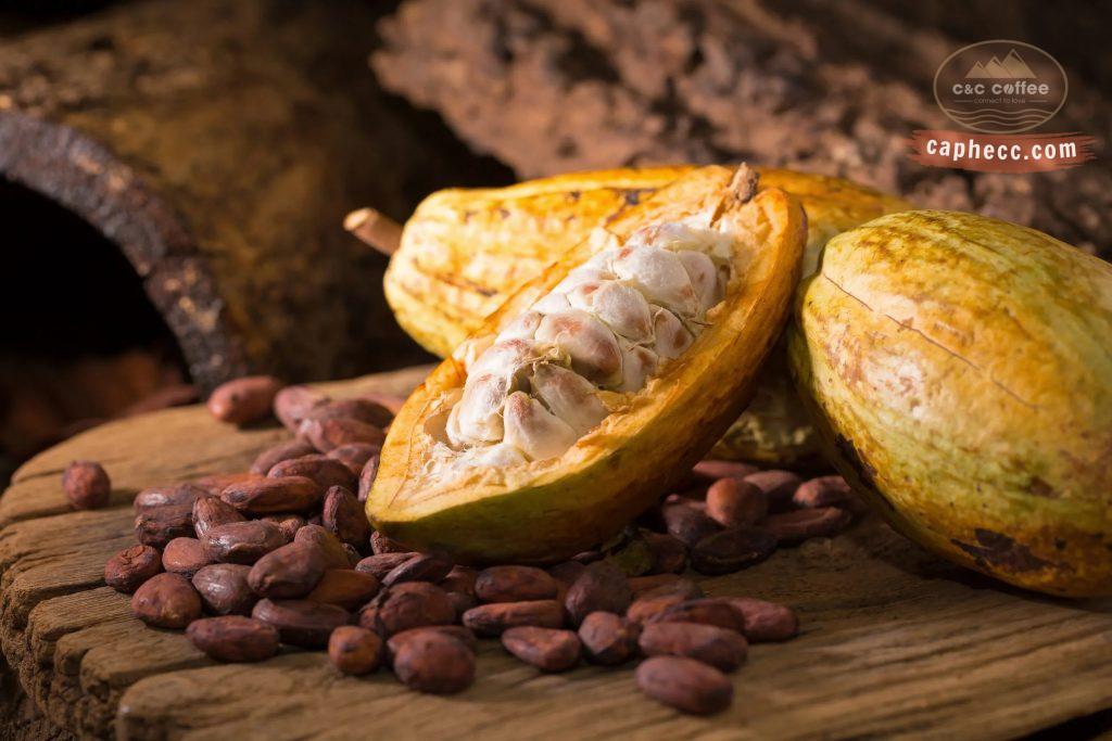 Quả cacao tươi (Theobroma cacao) là nguồn gốc của hạt cacao, nguyên liệu chính để ...
