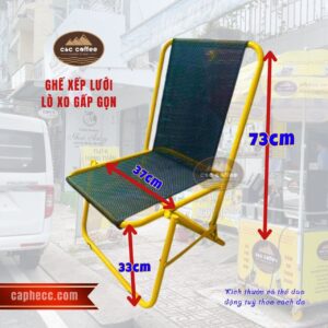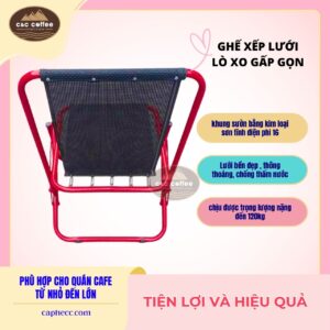 Ghế xếp lò xo lưới ĐEN thấp là sự kết hợp hoàn hảo giữa tính tiện dụng và phong cách, tạo nên không gian quán cà phê thêm phần độc đáo và thoải mái.