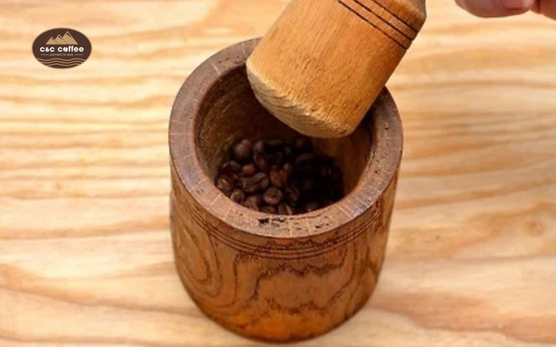 Cách xay này chỉ áp dụng cho lượng nhỏ hạt cà phê khi để vào bên trong lòng chiếc cối, rồi bạn dùng chày giã nhuyễn.