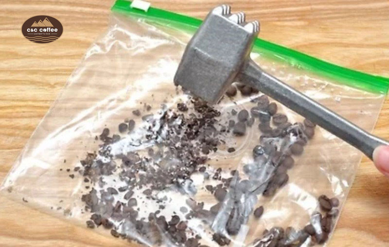 Bạn cũng có thể dùng búa để đập nát hạt cà phê dễ dàng và nhanh chóng. Đầu tiên, bạn cho hạt cà phê vào túi zip hoặc bất kì loại túi vào có độ dai chắc chắn, miễn không bị rách trong quá trình giã nhuyễn là được.