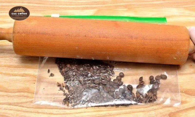 Cách làm rất đơn giản, bạn chỉ cần cho hạt cà phê vào bên trong túi zip có độ dai tốt, rồi lấy khăn khô bọc lại túi cà phê. Tiếp đó, bạn đặt nó trên mặt bằng cứng, rồi dùng tay ấn và lăn trục cán bột để nghiền nát hạt cà phê.
